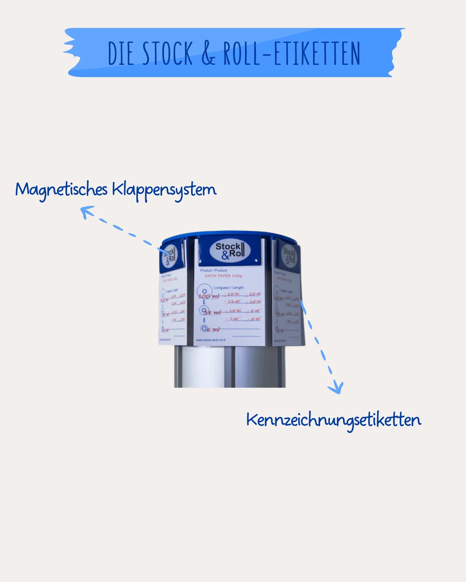 Dank des Magnetsystems an der Oberseite des Stock & Roll können Sie Ihr Material auf einen Blick wiederfinden!