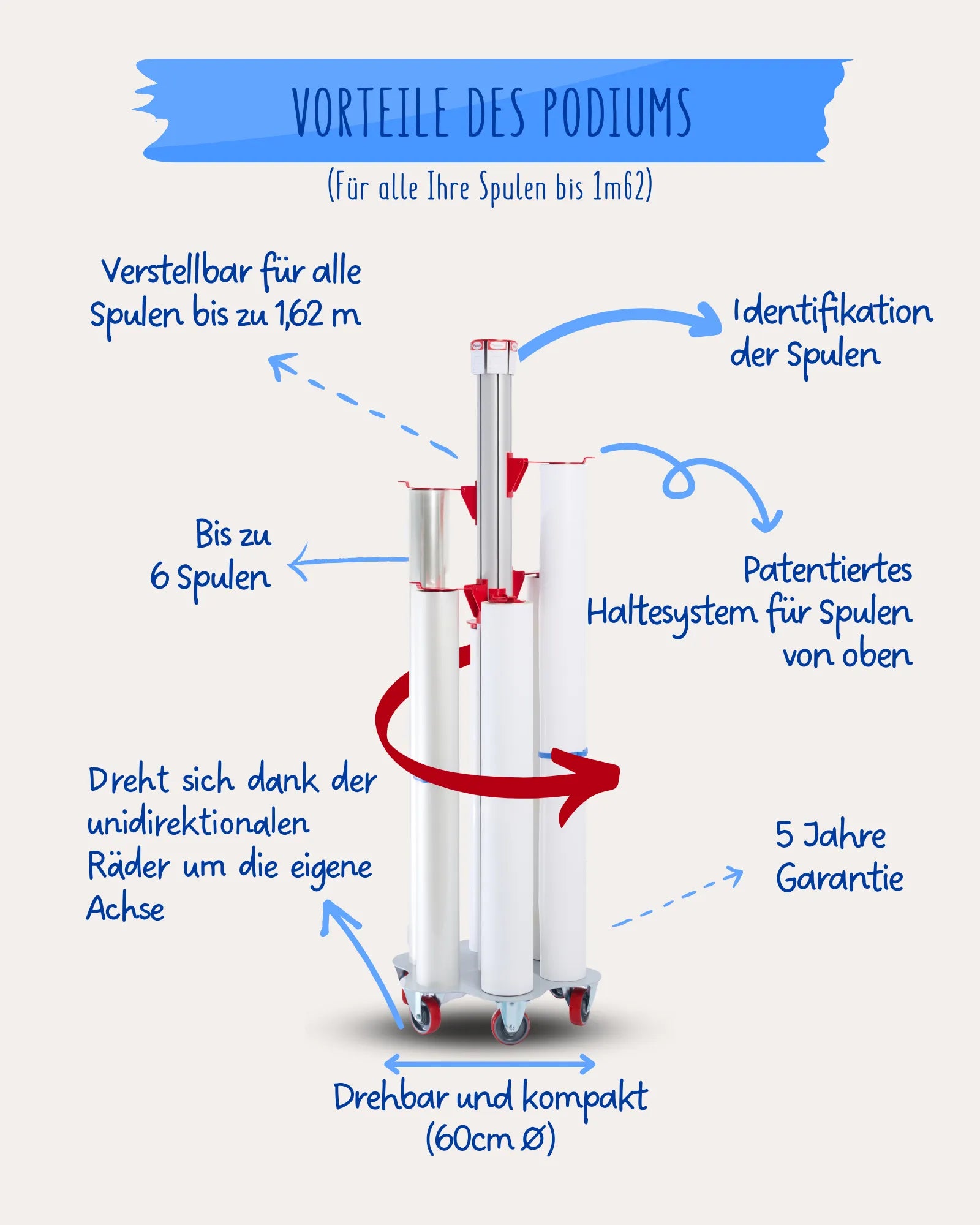 Dank seiner Einwegräder ermöglicht das Podium einen einfachen Zugriff auf jede Rolle, ohne dass das gesamte Rack verschoben werden muss. Ideal für Produktionsumgebungen, in denen jeder Quadratmeter zählt.