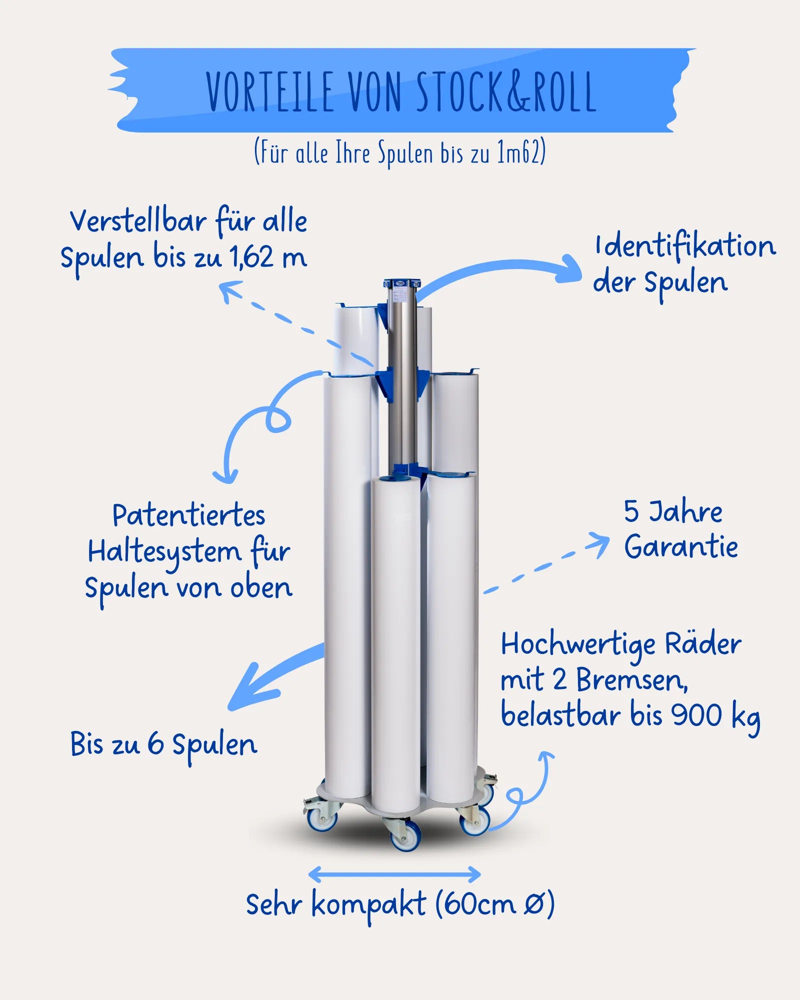 Der Stock & Roll ist ein kompakter, extrem wendiger Lager- und Transportwagen, mit dem Sie Ihre großformatigen Rollen einfach und sicher lagern und bewegen können.